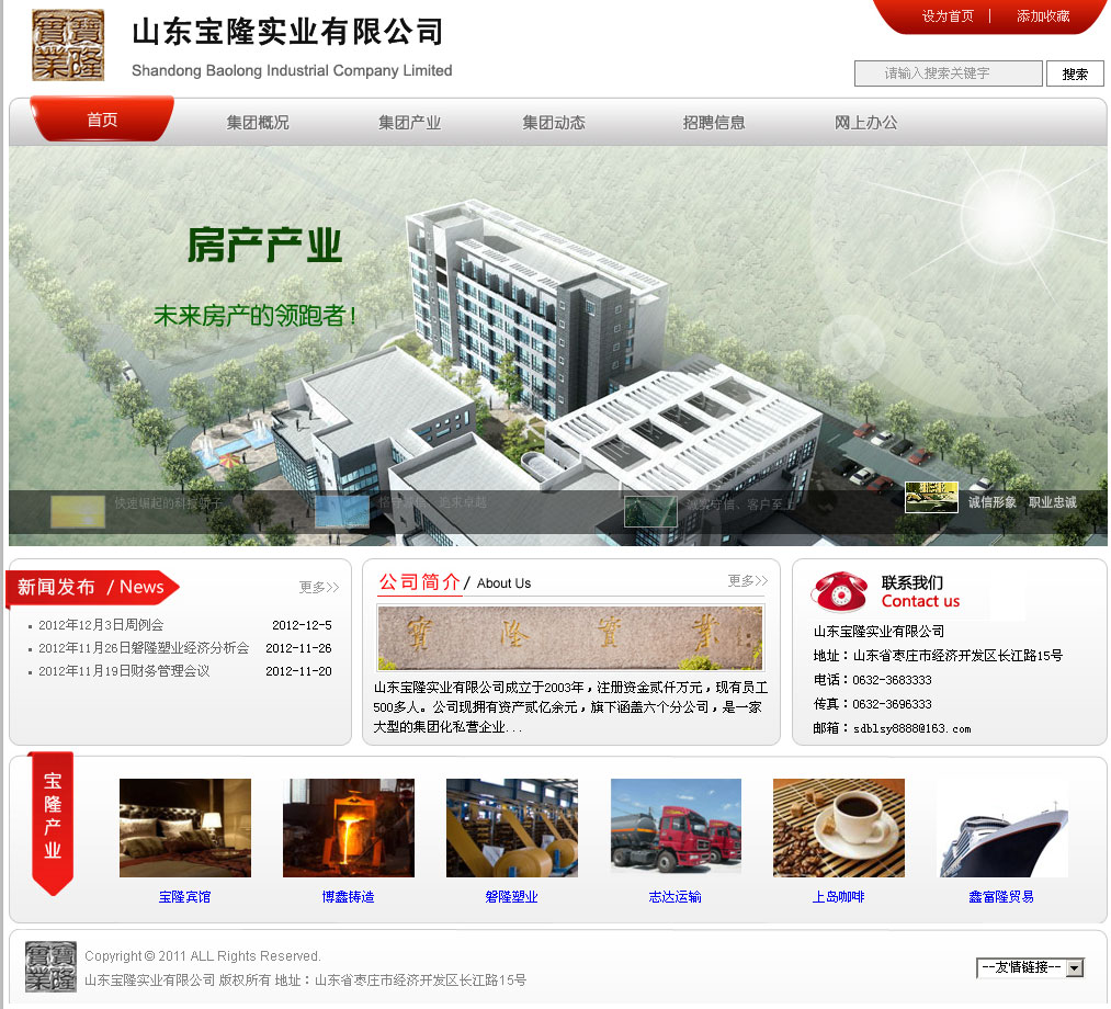 棗莊網(wǎng)站制作:山東寶隆實(shí)業(yè)有限公司成立于2003年,公司注冊資本金貳仟萬元,現(xiàn)有職工500余人。公司現(xiàn)擁有資產(chǎn)叁億余元,旗下涵蓋六個分公司。 公司總部位于山東省棗莊市工業(yè)園長江路15號,地處省級經(jīng)濟(jì)開發(fā)區(qū),南臨運(yùn)河,北臨京福高速公路,西距京滬高鐵,距著名的旅游景區(qū)臺兒莊運(yùn)河古城、微山湖濕地公園均40公里。地理位置優(yōu)越,交通便利,環(huán)境優(yōu)美。 公司是一家以銷售煤炭、石膏、水泥、熟料等建筑材料為主營業(yè)務(wù),以生產(chǎn)和經(jīng)營耐磨材料、塑編袋、物流運(yùn)輸、化工原料、地?zé)岵牧蠟檩o營業(yè)務(wù),同時經(jīng)營房地產(chǎn)行業(yè)的綜合性集團(tuán)化私營企業(yè)。公司自成立以來,經(jīng)營業(yè)績穩(wěn)定提升,與中國聯(lián)合水泥集團(tuán)有限公司(CUCC)、棗莊礦業(yè)集團(tuán)等多家大型企業(yè)建立了長期穩(wěn)定的戰(zhàn)略合作伙伴關(guān)系。 寶隆實(shí)業(yè)始終秉承著“恪守誠信,追求卓越”的經(jīng)營理念,以“誠實(shí)守信、客戶至上”為營銷宗旨,遵循“平等互利、合作共贏”的原則;以“樹寶隆形象,創(chuàng)寶隆品牌”為目標(biāo),艱苦奮斗、務(wù)實(shí)創(chuàng)新,公司在激烈的市場競爭中表現(xiàn)出巨大的進(jìn)取心,煥發(fā)出蓬勃生機(jī),用誠信和實(shí)力創(chuàng)造寶隆曠世偉業(yè),這是寶隆人不懈的追求! 2011年,寶隆實(shí)業(yè)已走過九年的發(fā)展歷程,九年,在漫長的歷史長河中只是短暫的瞬間,但對于寶隆人來說,這是一段永載史冊、奮發(fā)有為、成就百年基業(yè)的創(chuàng)業(yè)歷程,寶隆人用青春、汗水、和智慧譜寫了一曲華彩樂章。九年的櫛風(fēng)沐雨,九年春華秋實(shí);九載磨礪拼搏,九載碩果累。九年的堅守、堅韌、堅持,所有的積累,所有的沉淀,讓寶隆實(shí)業(yè)增強(qiáng)了實(shí)力和能力,讓寶隆人增添了勇氣和底氣,寶隆實(shí)業(yè)在激烈的市場競爭中敢于亮劍,敢于向世界一流巔峰企業(yè)發(fā)起挑戰(zhàn),這是全體寶隆人時刻保持著的、永遠(yuǎn)都不可磨滅的寶隆意志。 今天,寶隆人在此收拾好往日的榮耀。明天,寶隆人又將迎著朝陽,帶著堅毅的目光,踏上任重道遠(yuǎn)的征程,朝著下一個光輝楊帆遠(yuǎn)航…… |