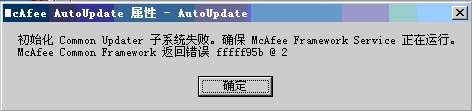 作為一名忠實(shí)的麥粉,多年來(lái)我一直使用McAfee這款殺毒軟件。但近一周開(kāi)始McAfee出現(xiàn)無(wú)法更新的狀況,自動(dòng)更新和手動(dòng)更新都失敗,彈出錯(cuò)誤提示窗口的信息為“初始化Common Updater子系統(tǒng)失敗.確保McAfee Framework service正在運(yùn)行.McAfee Framework service返回錯(cuò)誤 ffffffdf @ 3”。